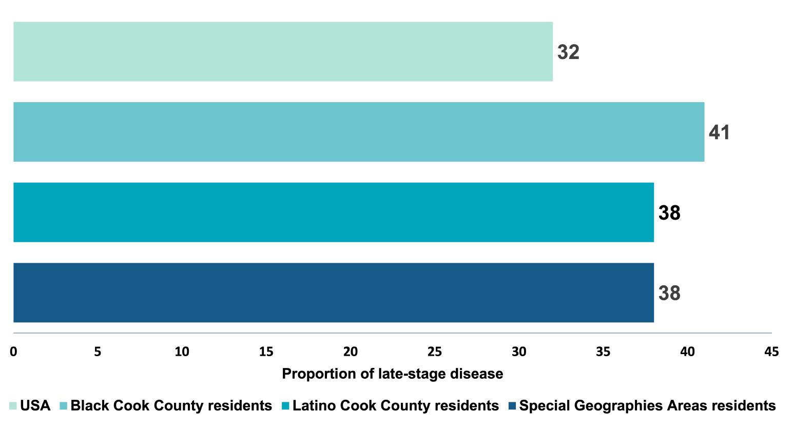 Black, Latino and Special Geographies Areas residents have 20-30% higher rates of late-stage disease as compared to the USA.