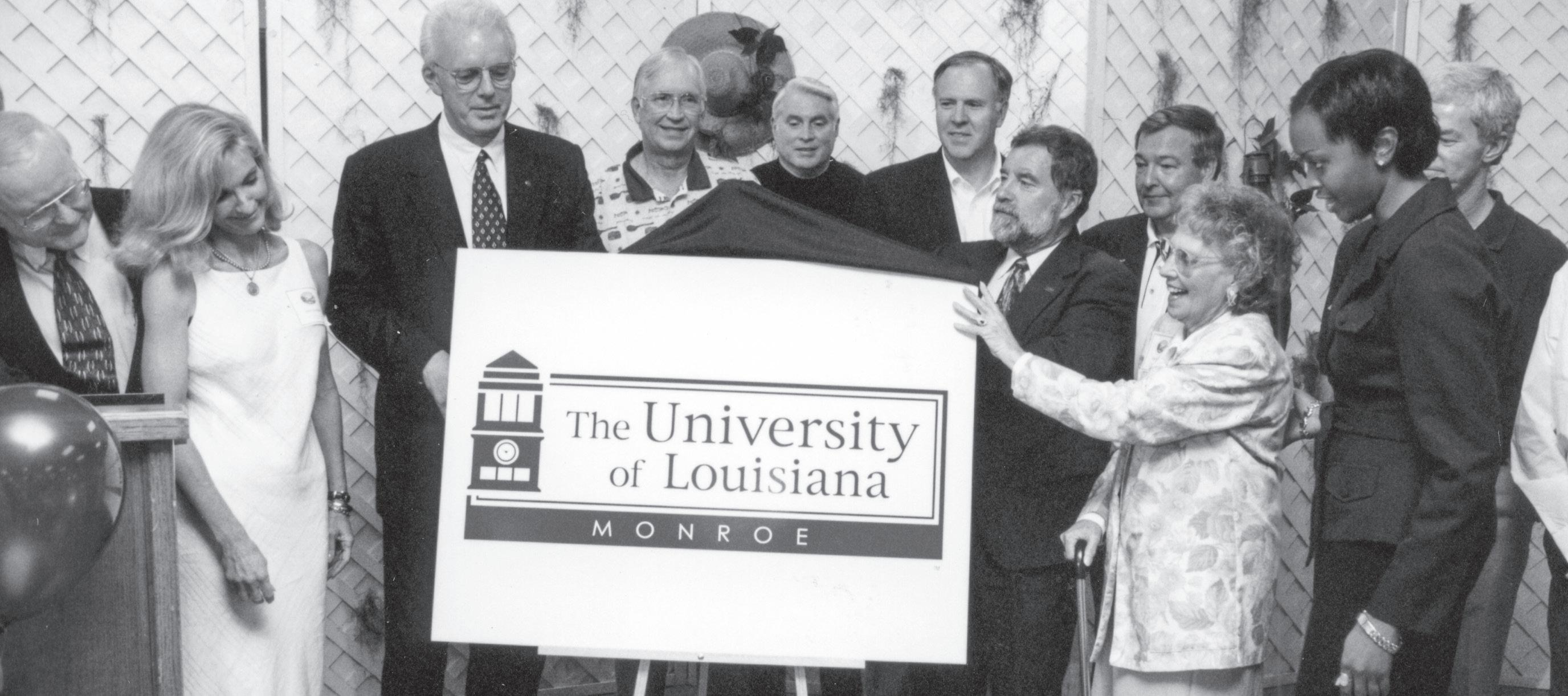 “The University of Louisiana Monroe prepares individuals from northeast Louisiana and beyond to compete, succeed, and contribute in an ever-changing global society through a transformative education while positively impacting society through research and service.”Mr. Lawson L. Swearingen, Jr. and Dr. Kitty DeGree unveil the first ULM logo with group in 1999. photo provided by Special Collections & Archives