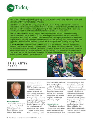 Today Pass it on: Great things are happening at UNT. Learn about them here and share our successes with your family and friends. • Designing for families. This spring, College of Visual Arts and Design students created handmade products from recycled old garments and materials to sell in the Friends of the Family Thrift Store to benefit the Denton County Friends of the Family Upcycle Project. Proceeds from the project, which occurs every semester, are used to assist families affected by domestic violence and sexual assault. • Hall of Fame knock out. It took a few jabs in the ring, but Richard “Dickie” Cole earned a boxing scholarship to attend UNT in the 1950s. In April, the boxing legend became the first inductee into the newly formed Texas Boxing Hall of Fame. Cole was honored for devoting 66 years of his life to the sport as a fighter, referee and judge at the amateur and professional levels, including some world title fights. From 1993 to 2014, he was head of Combative Sports for the Texas Department of Licensing and Regulation. • Live on The Ticket. The Musers of Sports Radio 1310 The Ticket closed out a weeklong college tour in April with a live broadcast from UNT’s Pohl Recreation Center, where President Neal Smatresk announced that alumnus and radio personality George Dunham (’88) would receive the Presidential Medal of Honor at May’s commencement. Not to leave anyone out, the president also inducted alumnus and talk show host Craig Miller (’88) into the “Intramural Hall of Fame,” and talk show sidekick Gordon Keith was presented with an “Honorary Doctorate of Gentle Musings.”