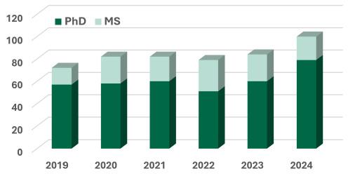 Our department has grown to include 21 tenure-track/ tenured faculty and 10 research faculty, with continued faculty success. Notably, Dr. Xiao Li has received the prestigious NSF CAREER Award in 2024, recognizing her groundbreaking contributions to liquid crystal and soft materials research. This marks the fourth NSF CAREER awardee in our department. We have several faculty members who have received University Distinguished Research Professor, Regents Professor, as well as other society, university and college awards in recent years. You will find highlights of faculty recognitions in this newsletter.