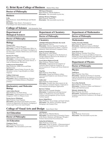 College of Science John Quintanilla, Dean Department of Biological Sciences Doctor of Philosophy Biology Wenasa Frifer Major Professor: Warren Burggren Dissertation: Crude Oil and Temperature Effects on Behavior, Regeneration, and Oxygen Consumption in the Planarians schmidtea Mediterranea and Girardia dorotocephala Derek D. W. Nelson Major Professor: Dane Crossley Dissertation: Cardiovascular Responses to Crude Oil and Hypoxia in Pelagic and Coastal Teleosts: A Study of Hemodynamic Mechanisms Jyotheeswaran Panapakam Major Professors: Arthur Goven and Pudur Jagadeeswaran Dissertation: Natural Product Screens for AntiThrombotic Activity Using Zebrafish as a Model Organism Vaibhavi Srinivasan Major Professor: Aaron Roberts Dissertation: Effects of Methylmercury Exposure on Behaviors in Fathead Minnows (Pimephales promelas)