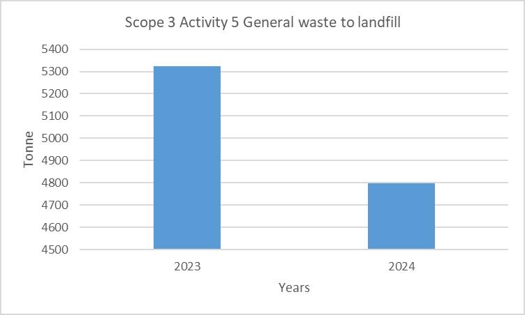 Scope 3 Category 5, Waste Generated in Operations, captures the greenhouse gas emissions from the disposal and treatment of waste produced by the University’s daily operations. This includes emissions from waste sent to landfill, recycling, composting, and Bokashi. Emissions arise from the decomposition of organic waste, the transportation of waste materials, and the energy used in recycling processes. As a University with extensive academic, administrative, and residential facilities, daily operational activities like office functions, food services, laboratories, and housing contribute significantly to waste generation.
