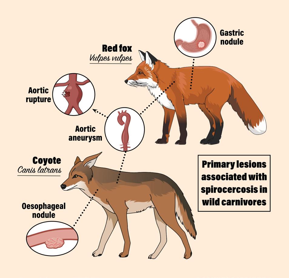 Spirocerca, a genus of nematode transmitted by dung beetles, infects both domestic dogs and a multitude of wild carnivore species worldwide. However, Spirocerca infections in wild carnivores and their potential implications for conservation are not fully understood.