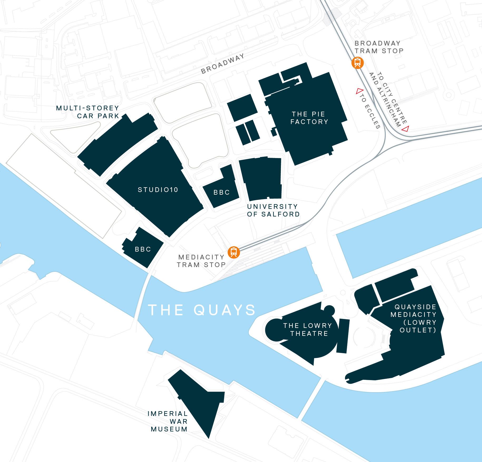 Follow the map to locate the University of Salford building at MediaCity. Please remember, only graduates are allowed in the check-in area.