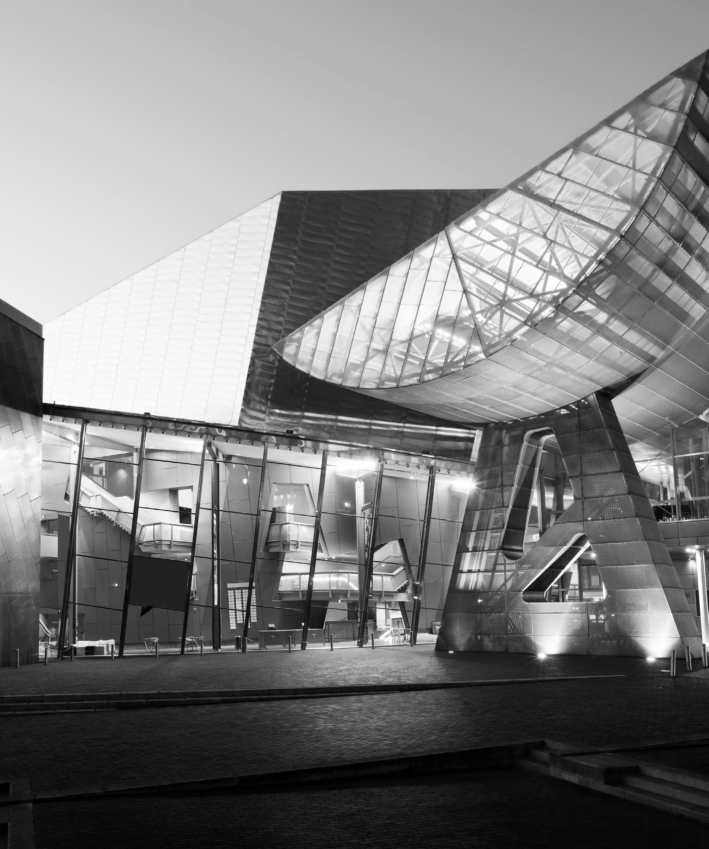 Check in and receive your robing and seat number tickets at the University of Salford building, MediaCity.