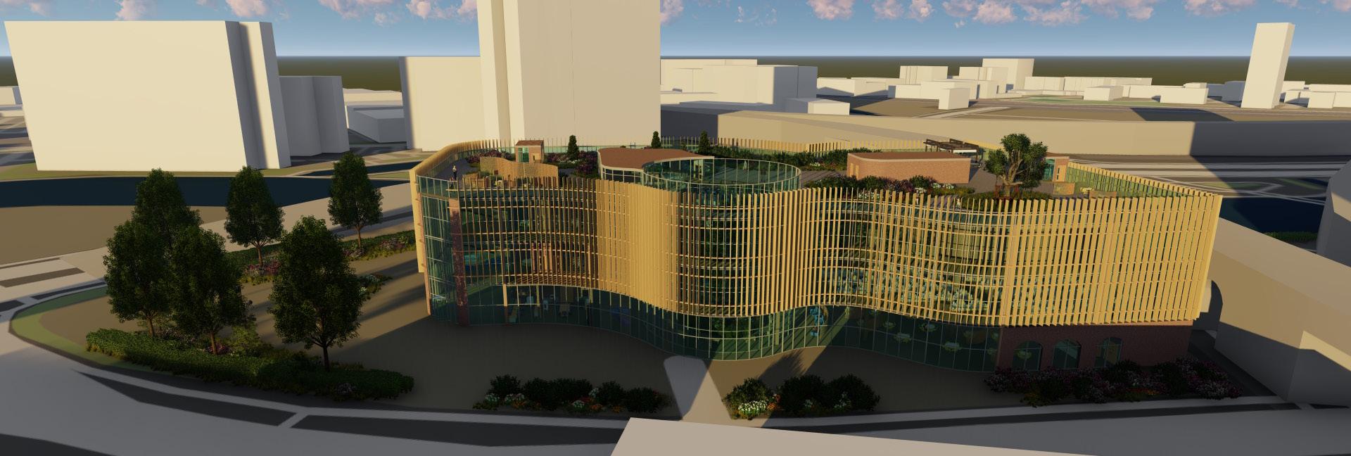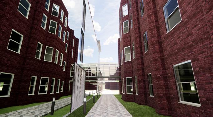 Within the landscape observing the front of the building. A visual representation of the buildings key features and purpose.
