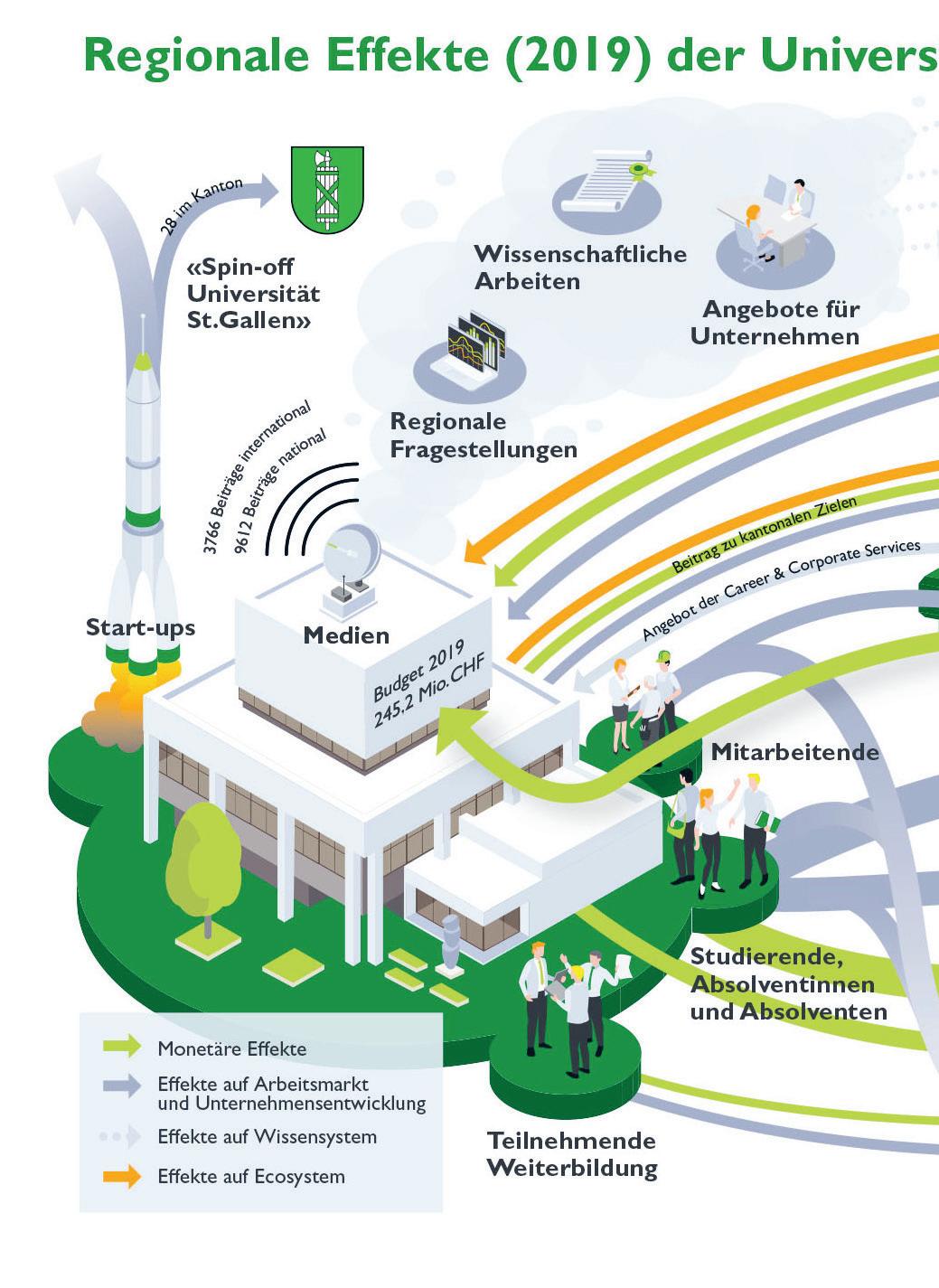 Im Berichtsjahr 2021 betrug der betriebliche Ertrag der Universität 264,1 Millionen Franken. Der Staats beitrag des Kantons St.Gallen ist für die vierjährige Leistungsperiode 2019-2022 fix definiert. 6,817 Mio.