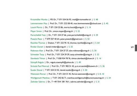 Kritzmöller Monika | PD Dr., T 071 534 56 92, mail@kritzmoeller.ch | S. 48 Lemmenmeier Max | Prof. Dr., T 071 222 08 40, max.lemmenmeier@icloud.com | S. 40 Loock Moritz | Dr., T 071 224 25 86, moritz.loock@unisg.ch | S. 14 Mayer Simon | Prof. Dr., simon.mayer@unisg.ch | S. 22 Partschefeld Yves | Dr., T 071 224 27 66, yves.partschefeld@unisg.ch | S. 39 Piwecki Peter | T 079 357 40 64, peter.piwecki@gmail.com | S. 52 Reschke Thomas | Diakon, T 071 222 95 10, thomas.reschke@unisg.ch | S. 64 Riniker Daniel | daniel.riniker@unisg.ch | S. 32 Robinson Alan | Prof. Dr., T 071 224 27 27, alan.robinson@unisg.ch | S. 30 Schneider Tanja | Prof. Dr., T 071 224 29 29, tanja.schneider@unisg.ch | S. 22 Slembeck Tilman | Prof. Dr., T 058 934 78 76, tilman.slembeck@zhaw.ch | S. 16 Stämpfli Regula | Dr., regula.staempfli@yahoo.de | S. 49 Strässle Paul Meinrad | Prof. Dr., T 071 983 51 42, p.m.straessle@bluewin.ch | S. 36 Studer Daniel | T 071 224 22 52, daniel.studer@unisg.ch | S. 50 Wettstein Florian | Prof. Dr., T 071 224 31 45, florian.wettstein@unisg.ch | S. 8, 10 Wohlgemuth Matthias | T 071 242 06 71, matthias.wohlgemuth@kunstmuseumsg.ch | S. 24 Zehnder Sabrina | Dr., T +49 7541 381 7611, sabrina.zehnder@unisg.ch | S. 31