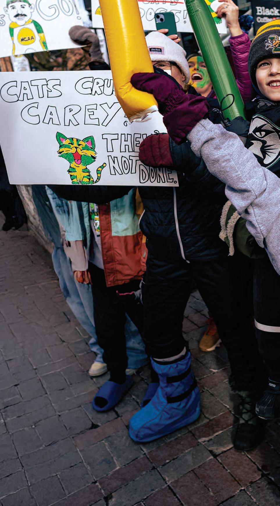 An estimated crowd of 4,000 joined the Vermont men’s soccer team on the Church Street Marketplace on Sunday, January 26, to celebrate the Catamounts 2024 National Championship. The Catamounts processed up Church Street to the top of the block, where fans and invited guests gathered around the stage to hear from the National Champions. Director of Athletics Jeff Schulman’89, UVM Interim President Patty Prelock, Burlington Mayor Emma MulvaneyStanak, and Vermont Governor Phil Scott spoke to the crowd about the Catamount’s achievements and their lasting effect on the state of Vermont.
