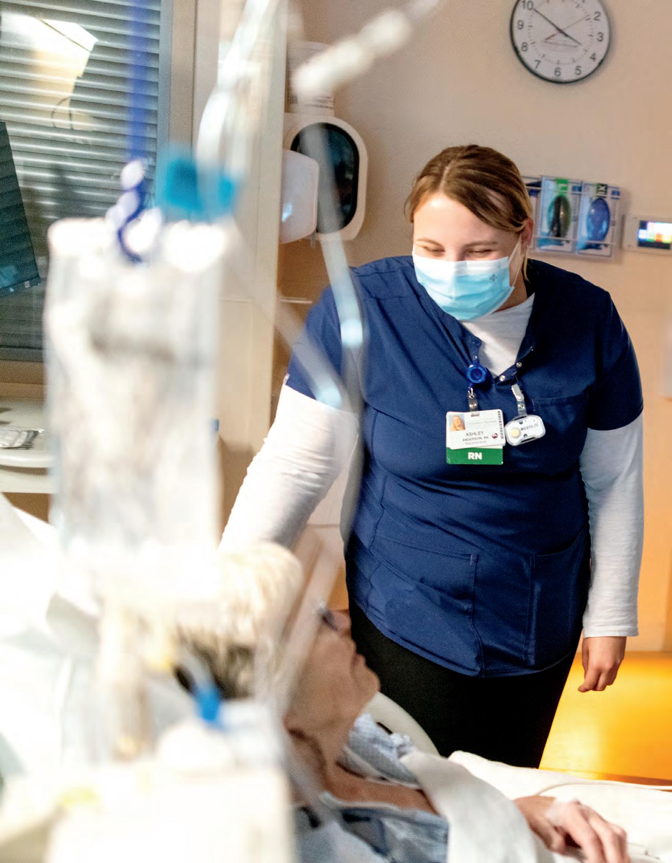 Medical student Em Battle '25 (right) observes as Ashley Anderson, R.N., cares for a patient at the University of Vermont Medical Center. Battle is among the Class of 2025 medical students participating in nurse-shadowing, which takes place during the advocacy module in the Professionalism, Communication and Reflection course.