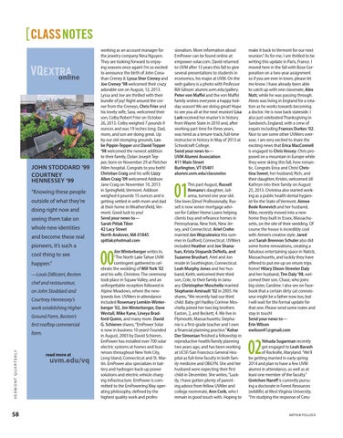 sionalism. More information about EmPower can be found online at: empower-solar.com. David returned to UVM after 13 years this fall to give several presentations to students in economics, his major at UVM. On the web gallery is a photo with Professor Bill Gibson: alumni.uvm.edu/gallery. Peter von Maffei and the von Maffei family wishes everyone a happy holiday season! We are doing great! Hope to see you all at the next reunion! Lisa Lark received her master’s in history from Wayne State in 2010 and, after working part time for three years, was hired as a tenure-track, full-time instructor in history in May of 2013 at Schoolcraft College. Send your news to— UVM Alumni Association 411 Main Street Burlington, VT 05401 alumni.uvm.edu/classnotes