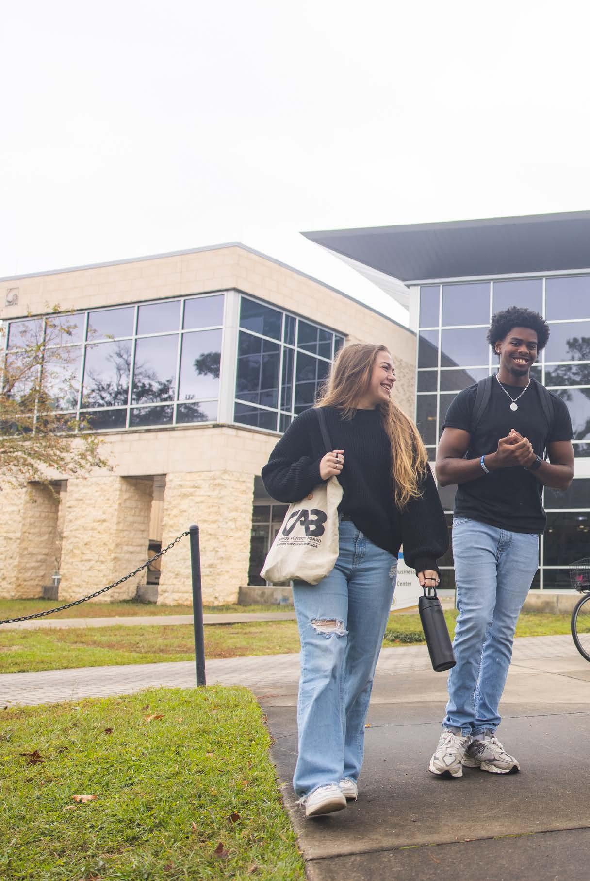 Cover: UWF students walk from the Lewis Bear Jr. College of Business complex.