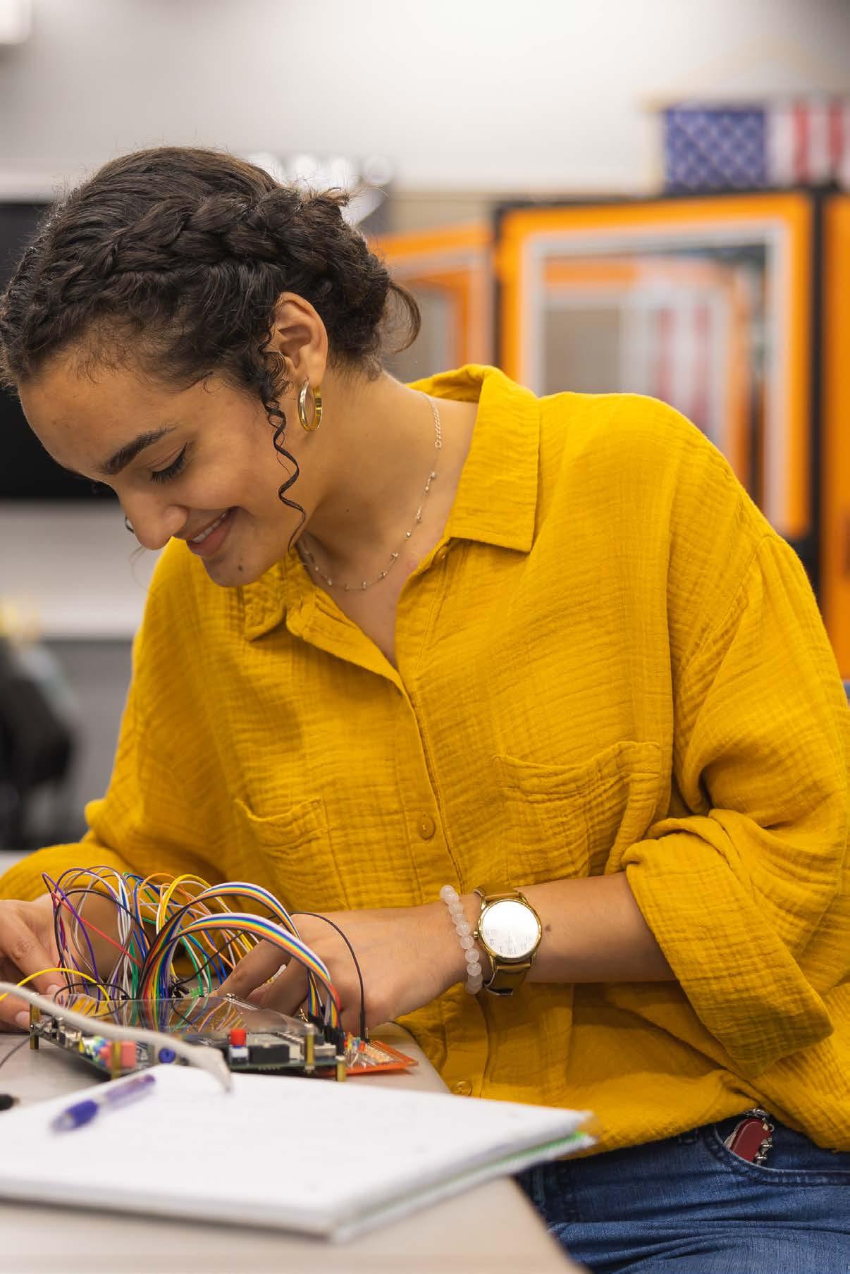 Above: Students compete at the Argonaut Challenge for JROTC cadets. The appearance of U.S. Department of Defense visual information does not imply or constitute DoD endorsement. Right: Mechanical engineering student Natalia DeJesus works in a lab at UWF Emerald Coast.