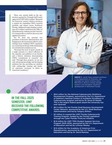 “As a child, I was fascinated by water, whether it was lakes in Illinois or the Gulf of Mexico on family trips,” Rummer said. “UWF allowed me to dive into handson marine science research, combining curiosity and discovery to ignite my lifelong passion.”