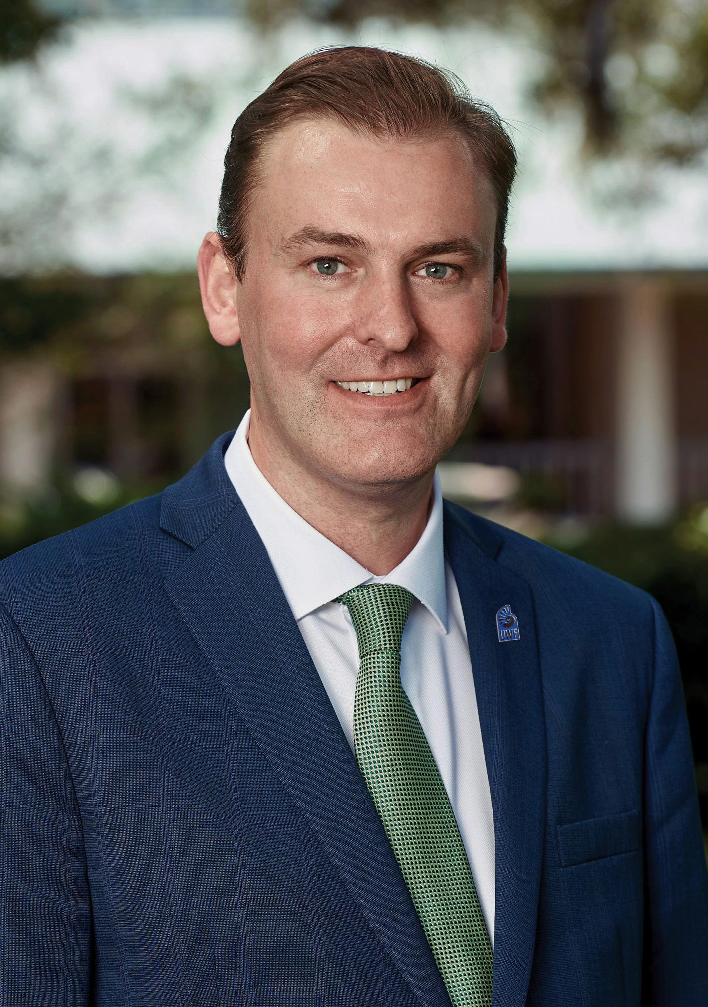 Tim Kinsella, executive director of UWF’s Center for Leadership, poses in UWF’s College of Business. Kinsella was appointed to the position in March 2022.