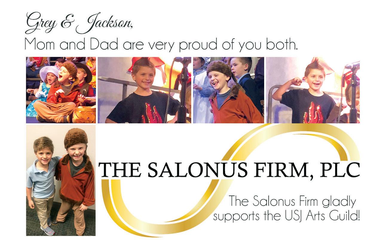 Alyson & Zac Fite are proud supporters of the arts at USJ! Congratulations and good luck to all of our performers! Have a great year! - Mr. Suber & Callie 27 Lamar Dr. | Jackson, TN 38305 dorris@dorrisappraisals.com | 731-664-7371