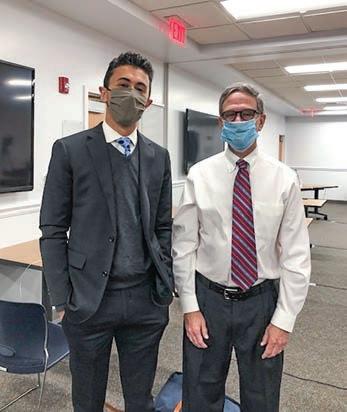 Senior Class President Krishin Parikh presents Director Vince Durnan with his diploma as he finally graduates from USN after 22 academic years.