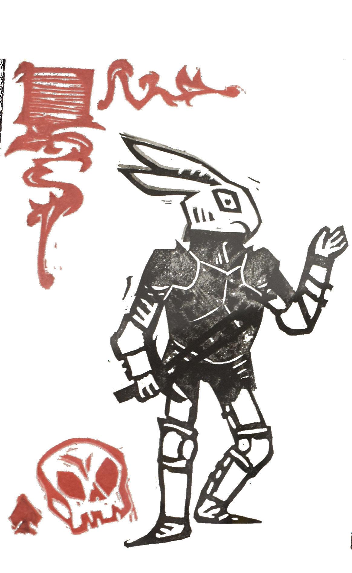 Robin Smith, studio art junior, has two linoleum block print pieces on display that use a limited color palette. “Knightly Rabbit” depicts a black-inked rabbit in armor with a red-inked the black-inked mace and chain.