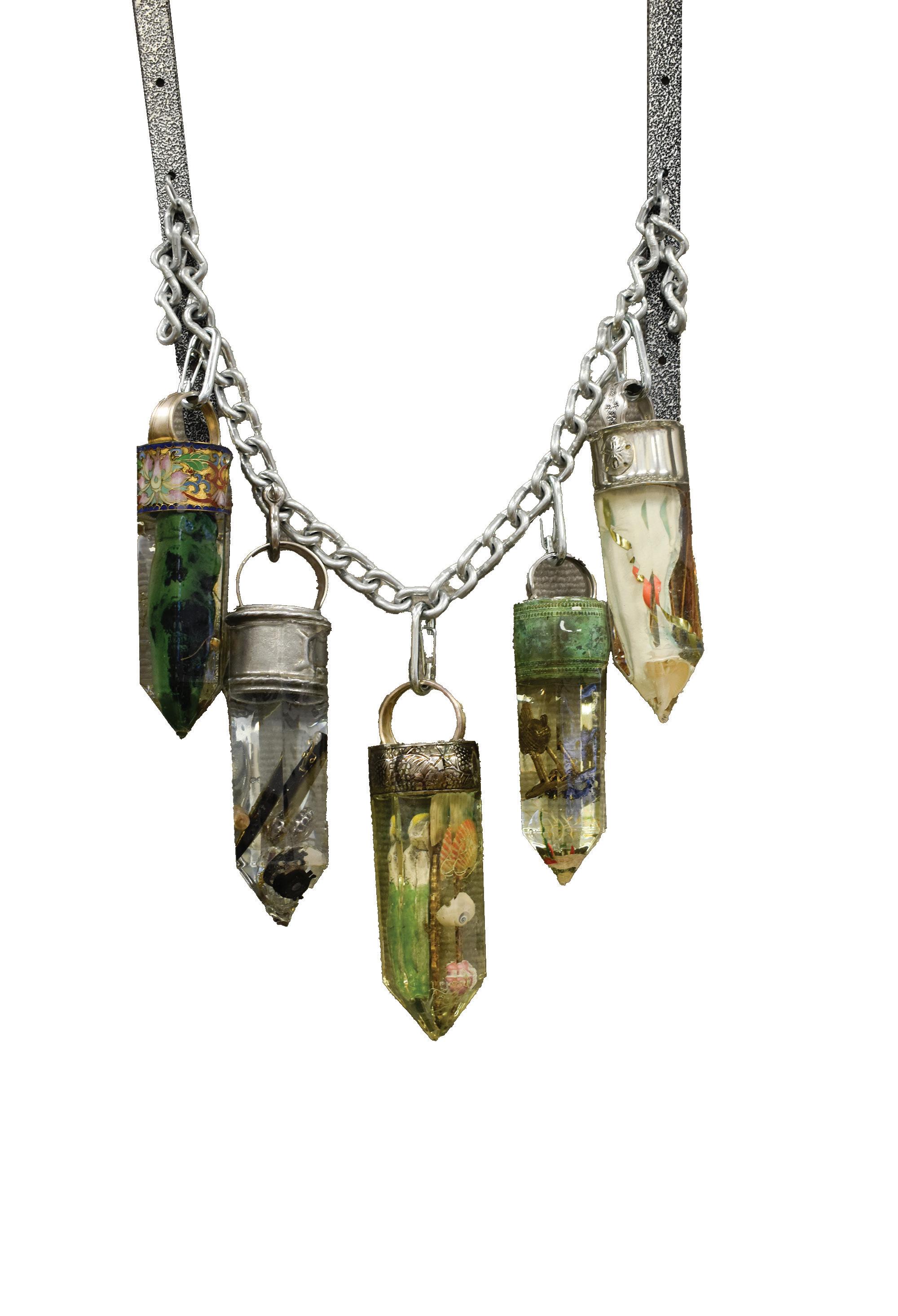 using the trinkets, silverplated serving dishes and silicone molds with resin to create a crystal effect. The final look resembles a large charm necklace, with each crystal having a unique identity.