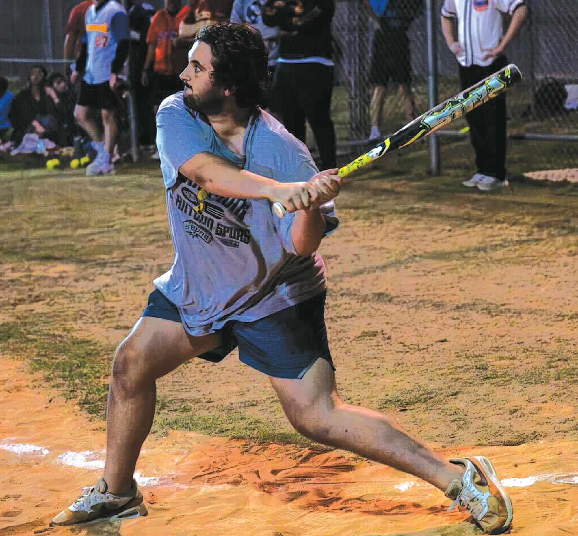 Texas State electronic media senior Sparti Locklin swings the bat during an intramural softball game, Wednesday, Nov. 12, 2025, at the Bobcat Village Fields.