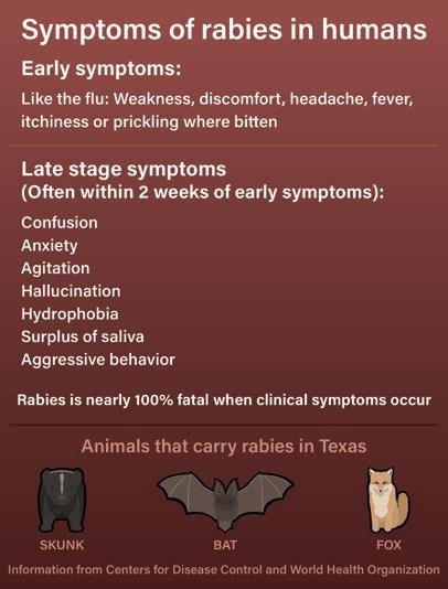 Kate Esqueda, community health services manager for the Hays County Health Department, said rabies activity has increased in 2026 compared to previous years. There is also a possible shift toward foxes sustaining rabies at a higher level than skunks, who are the largest host in Texas. This shift has not yet been confirmed by DSHS.
