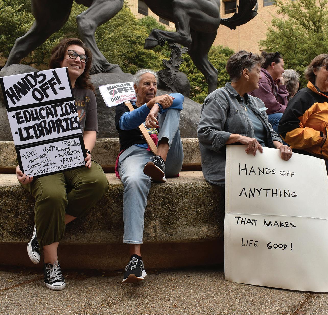 Local Residents participate in the nation wide Hands Off protests, Saturday, April 5, 2025, at the Fighting Stallions. The Hands Off movement protests President Donald Trump’s policies.