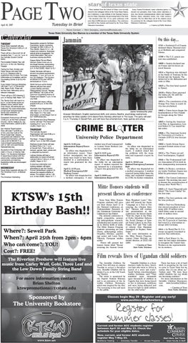 There has been a lot of hard work in preparing for the tour to come to Texas State but we realize that it’s not about us,” Tarhini said. “We have been called idealists but our ideals are becoming realities.” For more information on the Invisible Children Movement, visit www.InvisibleChildren. com. — Courtesy of Texas State Public Relations