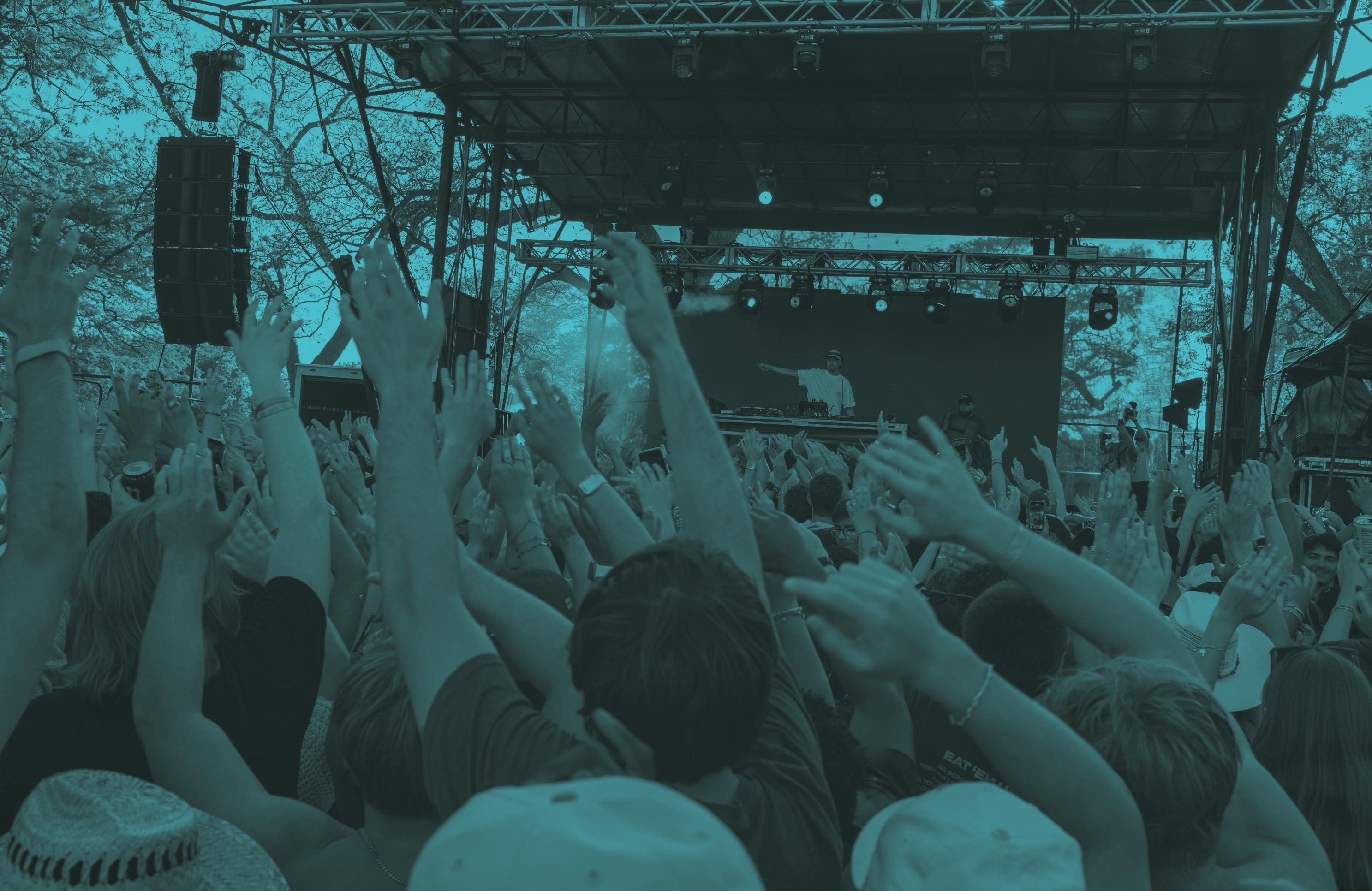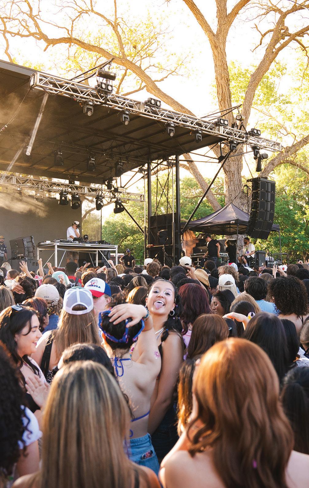 (Bottom) Students wave their hands to the left during DJ and producer ACRAZE’s set at River Fest 2025 in Sewell Park, Thursday, April 10, 2025, in San Marcos.