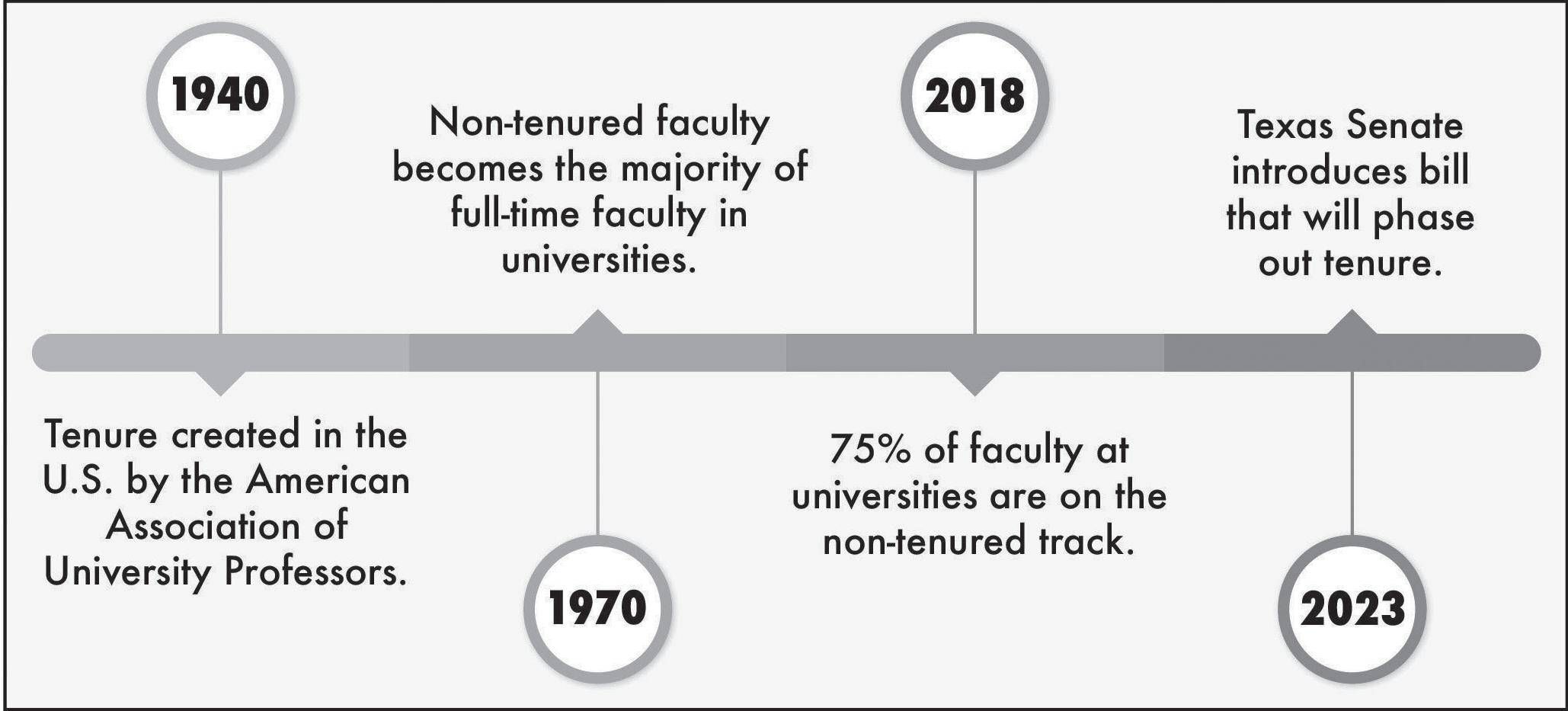 In 2022, Lt. Gov. Dan Patrick vowed to eliminate academic tenure after the Committee of Counsel on Academic Freedom and Responsibility at The University of Texas Austin released a resolution stating that professors should be free to research any topic.