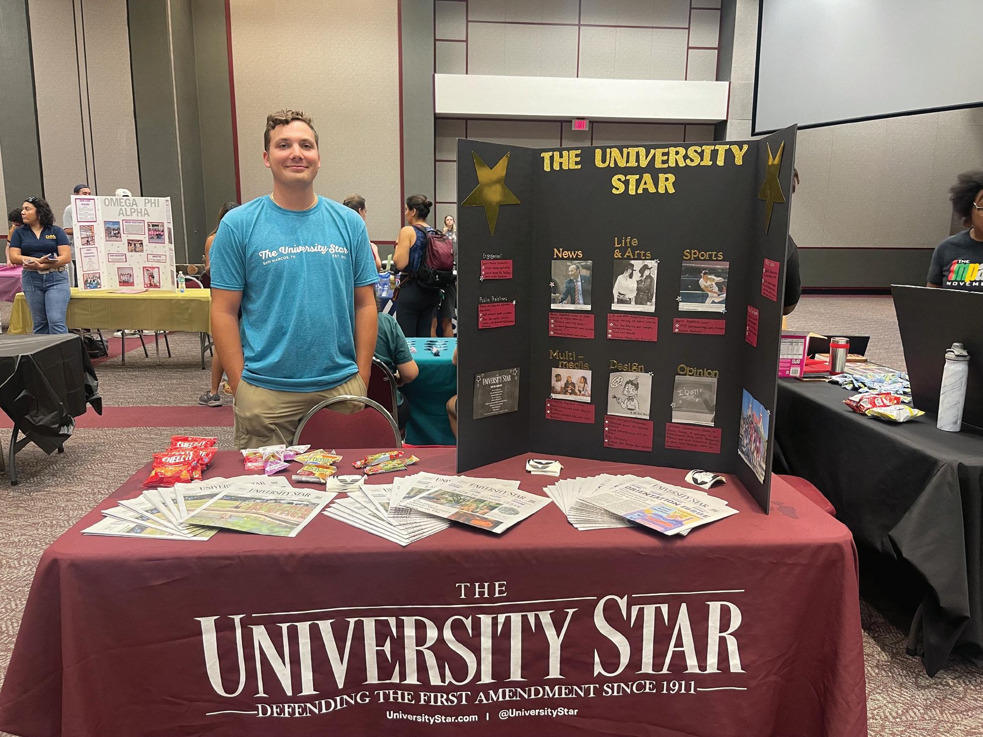 Texas State journalism senior Dillon Strine poses with The University Star table at a recruiting event, Monday, Aug. 29, 2022, at the LBJ Ballroom.