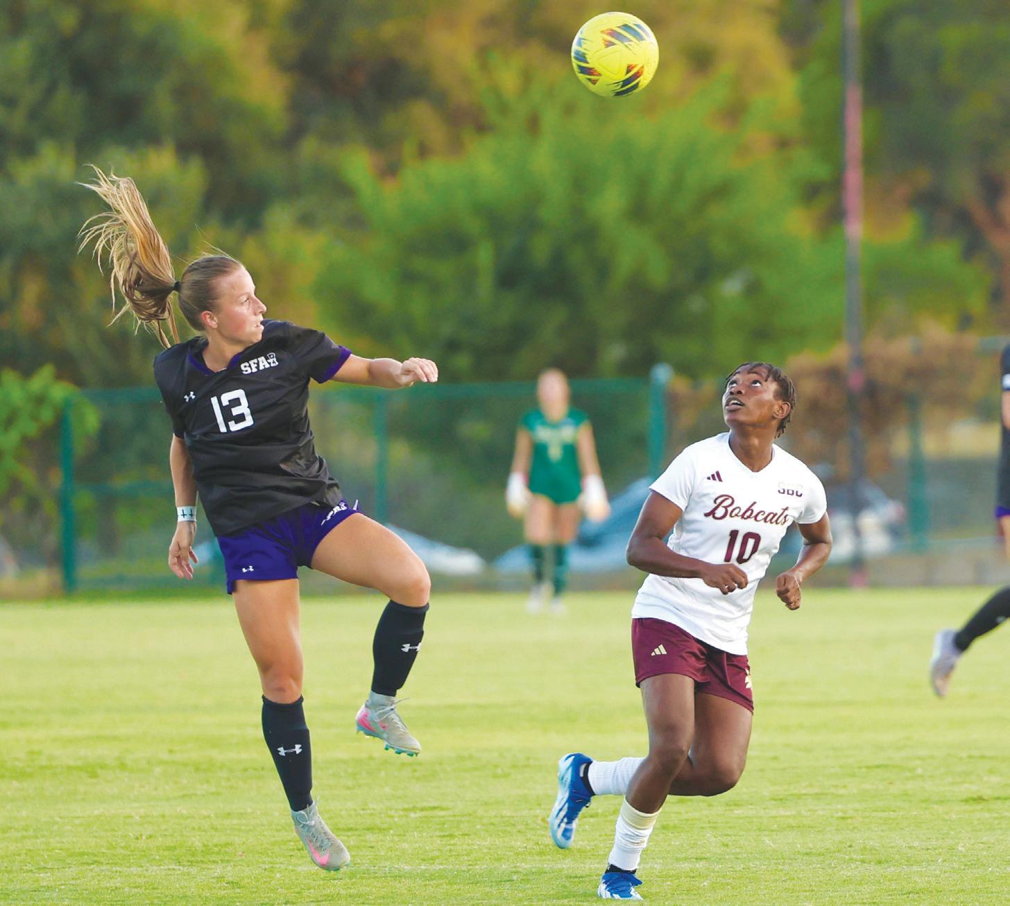 TXST sophomore midfielder Helen Alormenu (10) watches as Stephen F. Austin’s Alexis Miller (13) hits a header, Thursday Aug. 28, 2025, at Bobcat Soccer Complex. The Bobcats beat The Lumberjacks 5-1.