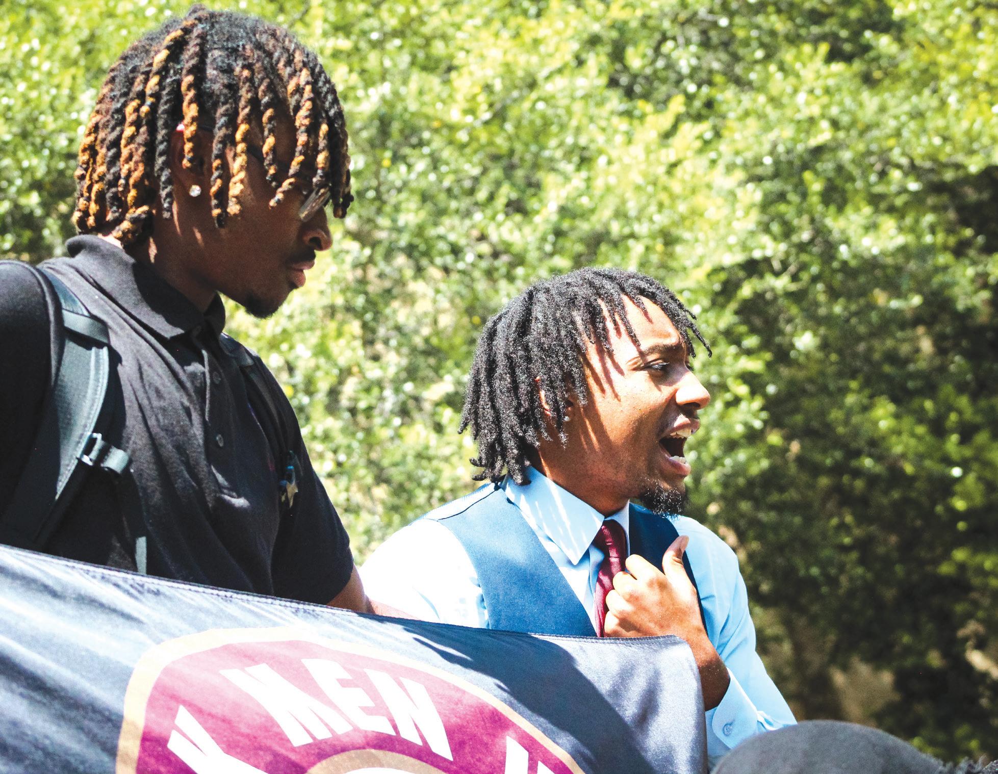 Ri’Chard (right) and member JT Bowers (left) give a speech about the new free speech policy and the hate Black students are facing, Wednesday, Sept. 17, 2025, at The Stallions.