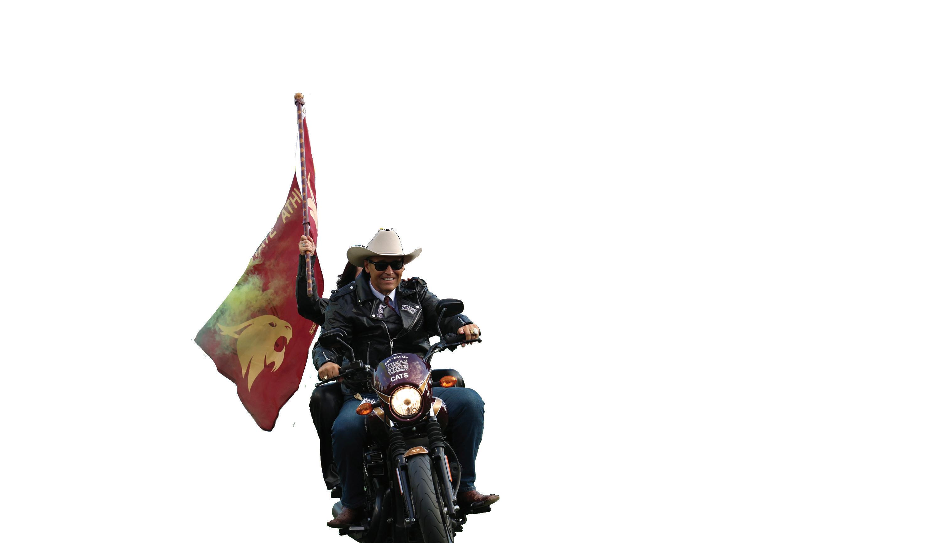 Boko leads the football team onto the field from a motorcycle, before the game against Arizona State, Saturday, Sept. 12, 2025, at UFCU Stadium. The Sun Devils beat the Bobcats 31-28.