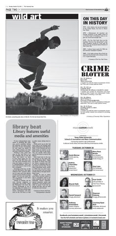 Oct. 19, 10:00 p.m. Bexar Hall Minor in possession A student was cited for minor in possession of alcohol. This case is under judicial review. Oct. 20, 1:42 a.m.. Comanche Street Driving under the influence of alcohol by a minor A student was arrested for DUI-minor and transported to Hays County Law Enforcement Center. The student is awaiting a court date. Oct. 20, 6:00a.m. Speck Parking Lot Possession of drug paraphernalia Two students were cited for possession of drug paraphernalia. This case is under judicial review. Oct. 20, 11:39 p.m. Providing alcohol to a minor Retama Hall A student was cited for minor in possession of alcohol and another student was arrested for providing alcohol. Kirk Owens, accounting junior, does a tre-flip Oct. 29 at the San Marcos Skate Park.