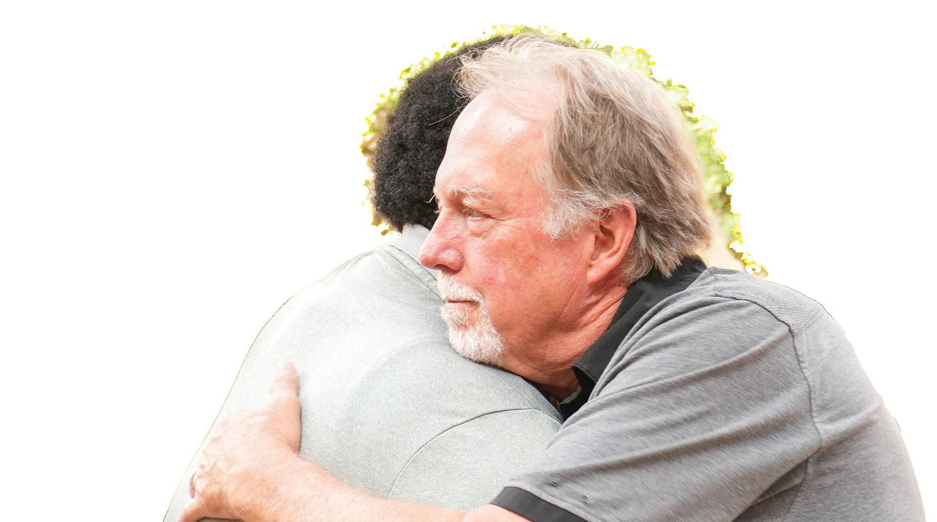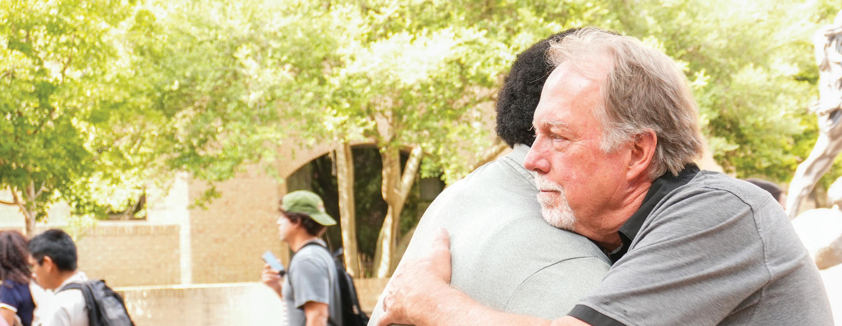 Texas State Communication Studies senior Devin Prophet (left) greets pastor Jamie Bouzard (right) between classes, Wednesday, Nov. 19, 2025, at Texas State. Prophet said Bouzard helped him find his place on campus by leading him to Black student organizations.