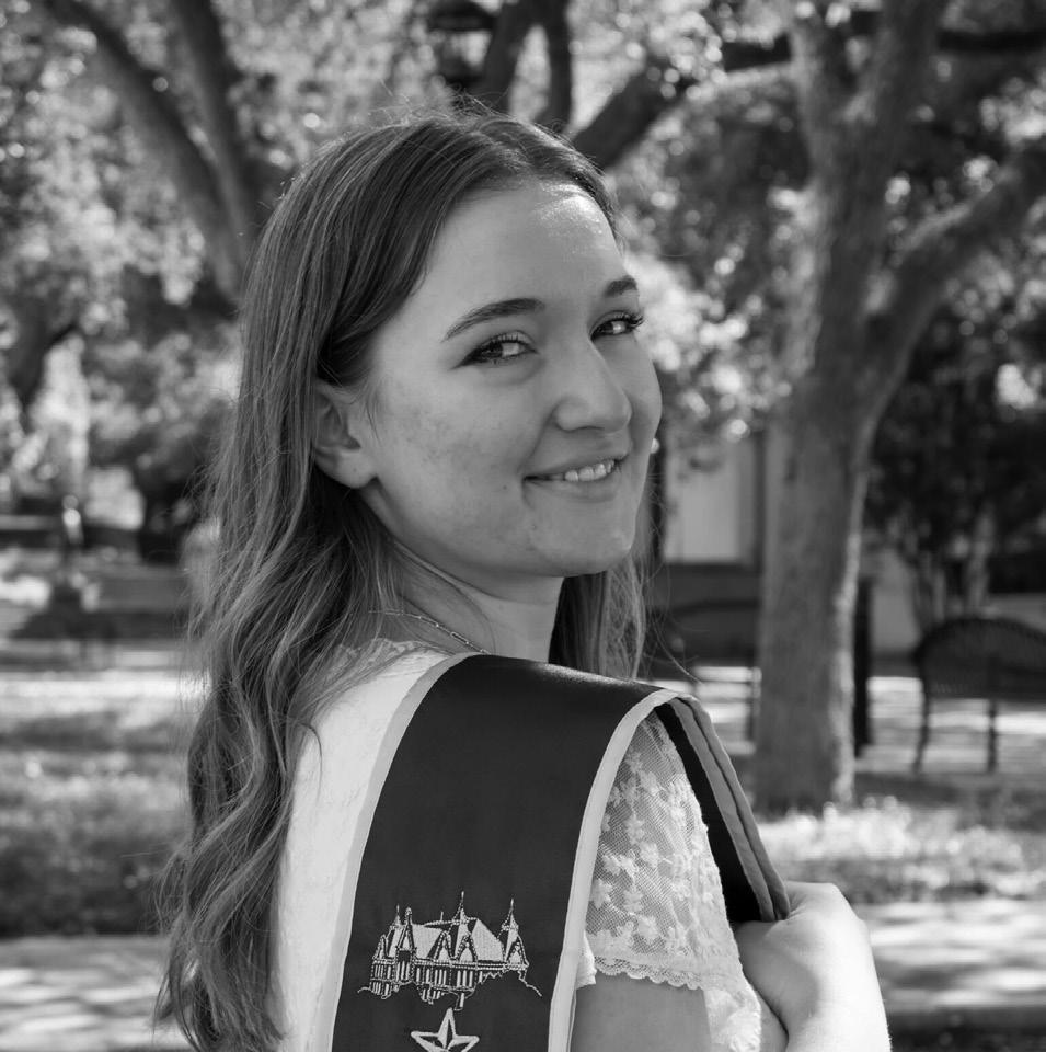 Life and Arts Reporter Cara Cervenka poses for her graduate photos, Saturday, Nov. 15, 2025, near TrauthHuffman Hall at Texas State.