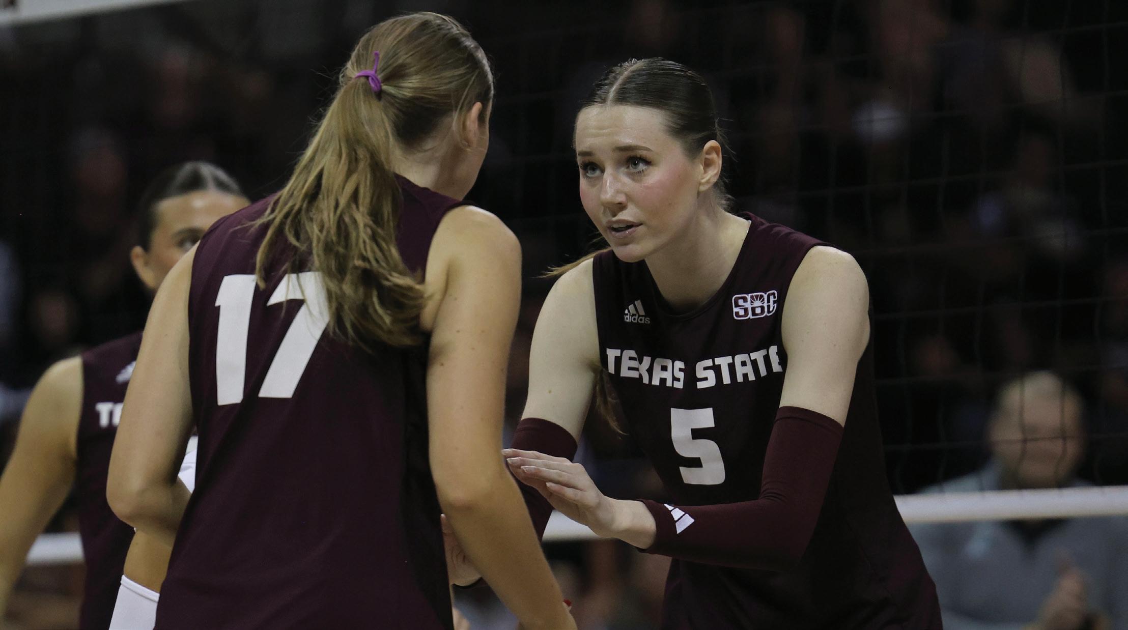 Texas State senior middle blocker Jade Defraeye (5) talks with sophomore setter Anna Blaine (17) after giving up a kill to Coastal Carolina, Friday, Nov. 7, 2025, at Strahan Arena. The Bobcats swept the Chanticleers 3-0.