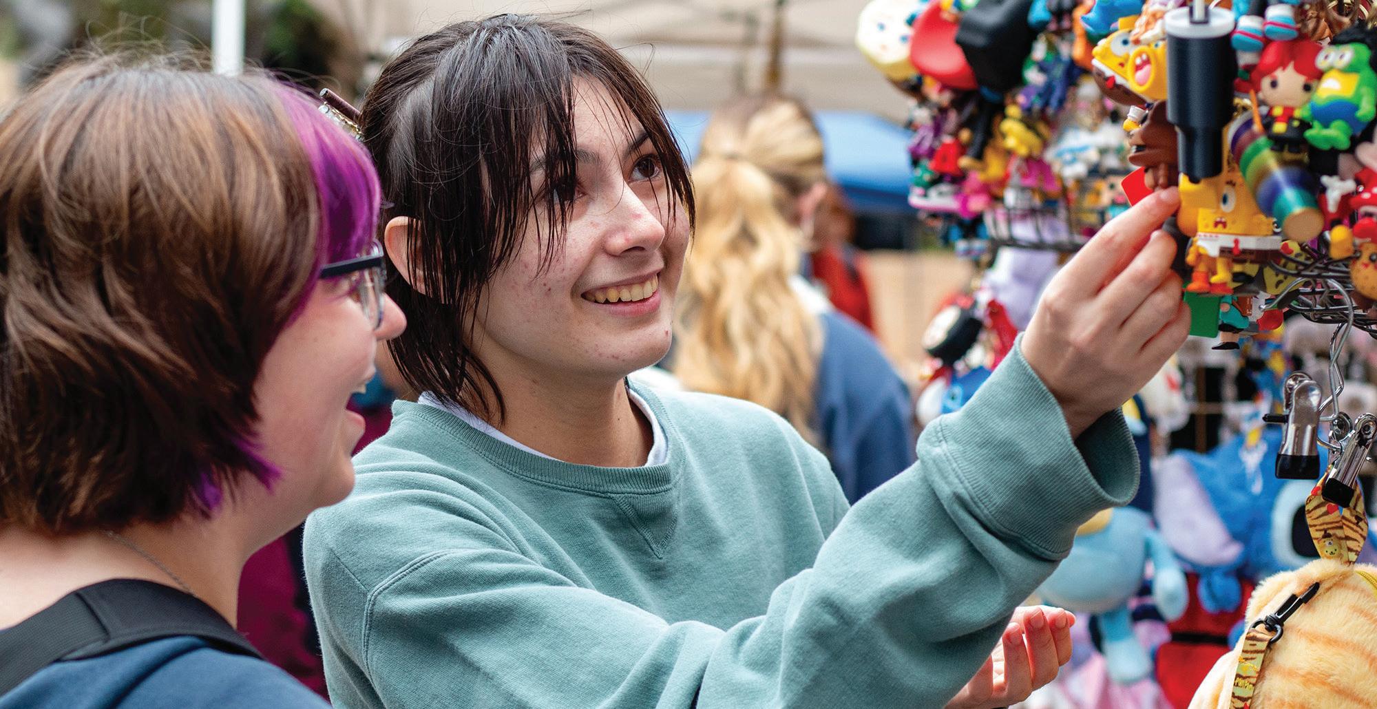 sophomore Quinn Brasher (Right) and biochemistry sophomore Alissa Short (Left) browse keychains and trinkets sold at Market Day, Wednesday, Feb. 12, 2025, on the Quad. The variety of vendors’ goods included food, jewelry, crocheted goods, knick knacks and more.