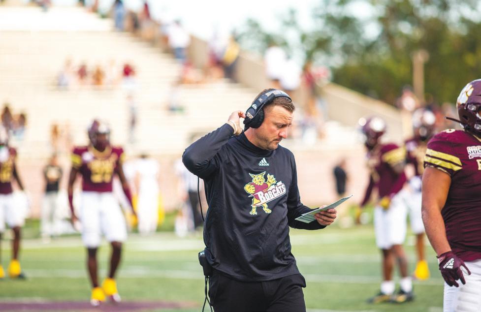 Texas State head football coach Jake Spavital goes over the playbook during a game against the University of Southern Mississippi, Saturday, Oct. 22, 2022, at Bobcat Stadium. The Bobcats lost 20-14.