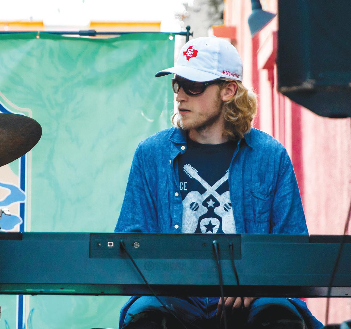 Texas State sound recording technology senior Jack Callaghan plays keyboard with the band, Slick, during the San Marcos Festival, Friday, Oct. 21, 2022, at Kissing Alley.