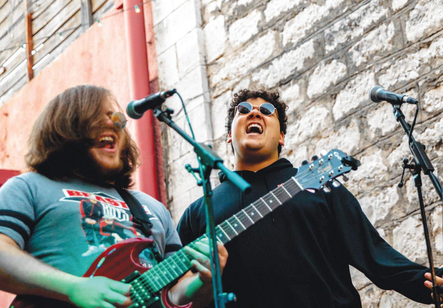 Texas State music studies senior Aaron Dworaczyk (left) performs alongside Slick lead singer Jose Cafaro during the San Marcos Festival, Friday, Oct. 21, 2022, at Kissing Alley.