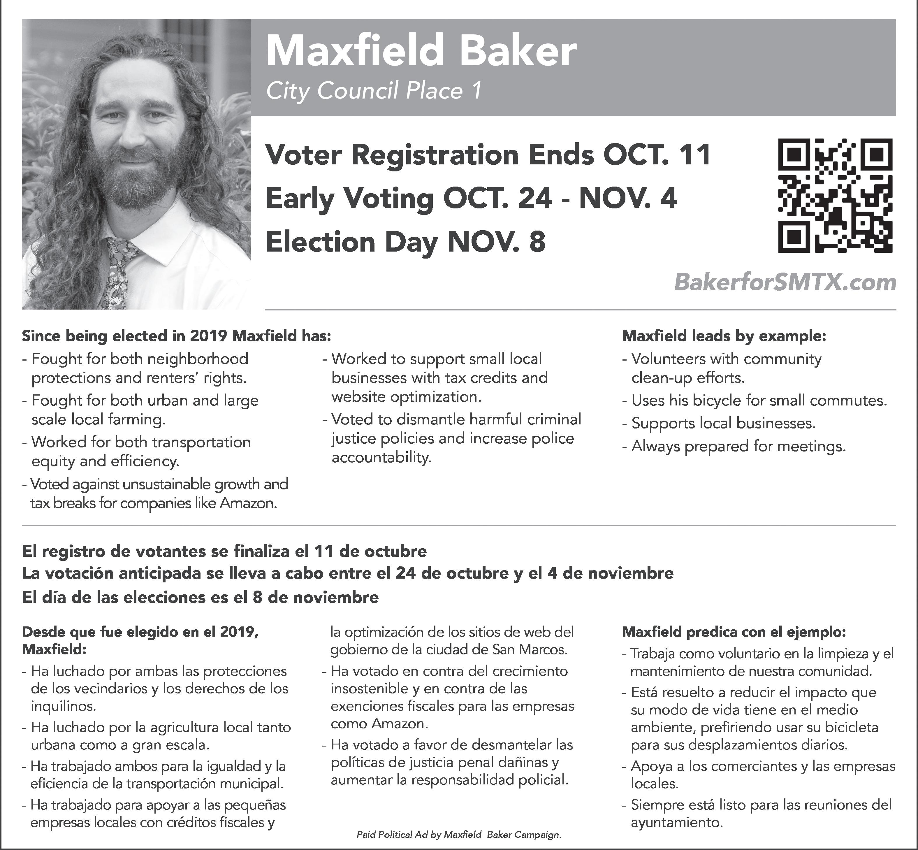 Early voting began on Oct. 24. To learn more about voter registration status or polling locations, visit VoteTexas.gov. If you are registered in San Marcos, you can vote at the LBJ Student Center room 3-21.3 during early voting and on Election Day.