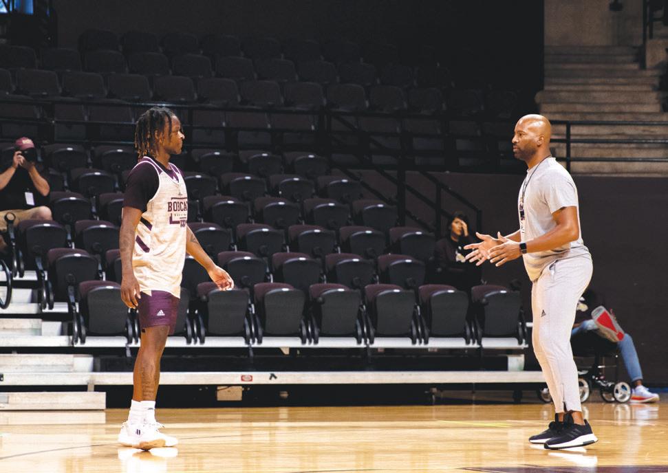 Texas State junior guard Brandon Davis receives instruction from assistant coach Donte Mathis, during the first public men's basketball practice, Friday, Oct. 21, 2022, at Strahan Arena.