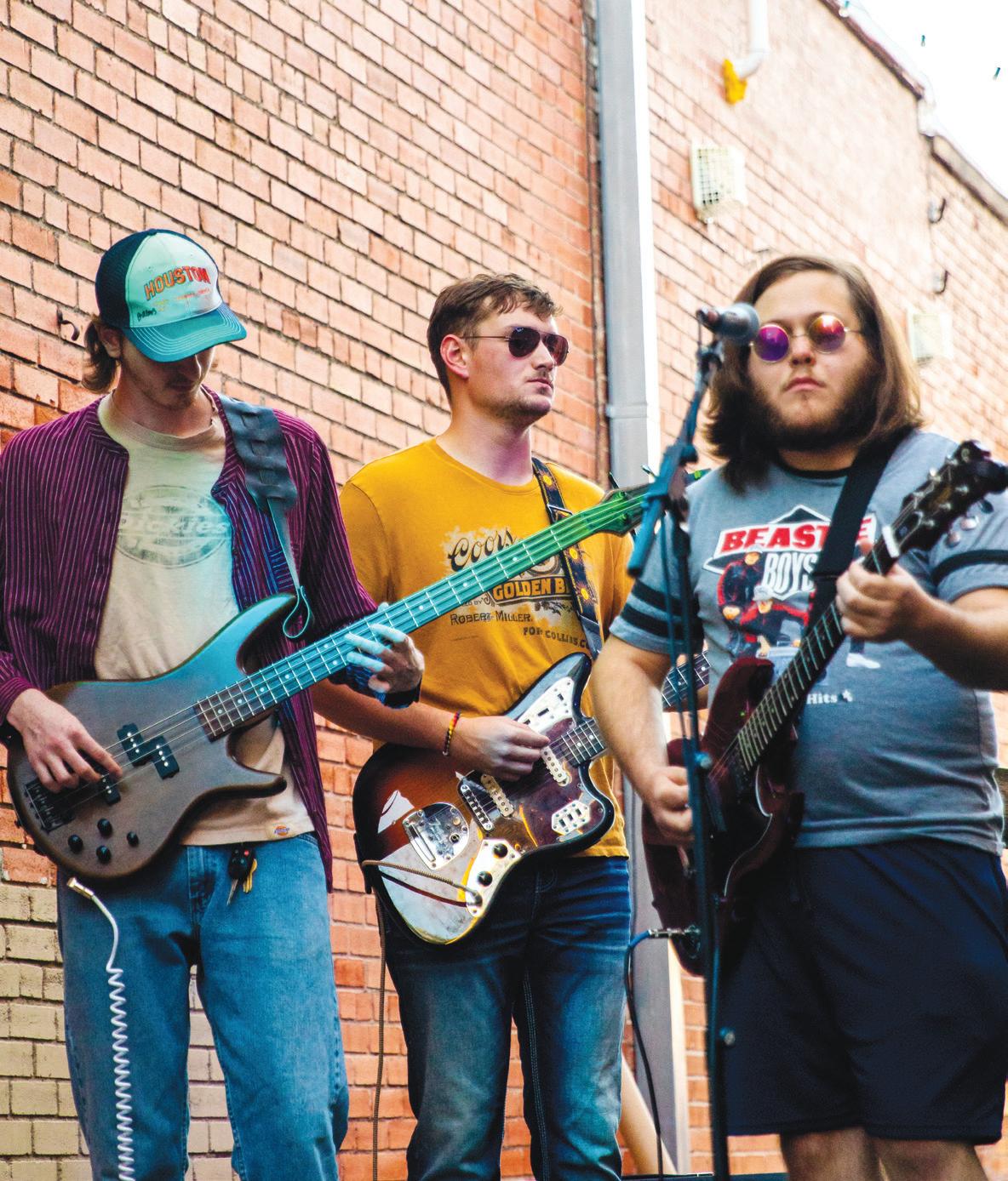 Texas State (left to right) sound recording technology junior Hayes Howard, mass communication senior Carson Weaver, and music studies senior Aaron Dworaczyk perform with their band, Slick, during the San Marcos Festival, Friday, Oct. 21, 2022, at Kissing Alley.
