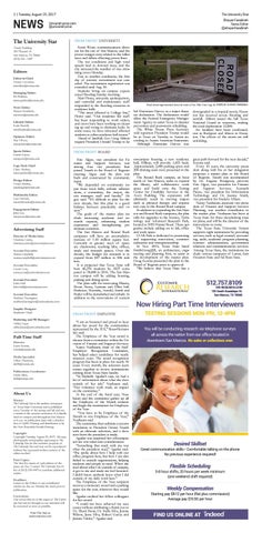 Advertising Staff Director of Media Sales: Christina Castro, christina.castro@universitystar.com Account Executive: Marisa Campbell, marisa.campbell@universitystar.com Account Executive: Carina Cruz, carina.cruz@universitystar.com Account Executive: Folee Hall folee.hall@universitystar.com Account Executive: Matthew Harrington matthew.harrington@universitystar.com Graphic Designer: Stephanie Cloyd Marketing and PR Manager: Ashley Lujan ashley.lujan@universitystar.com