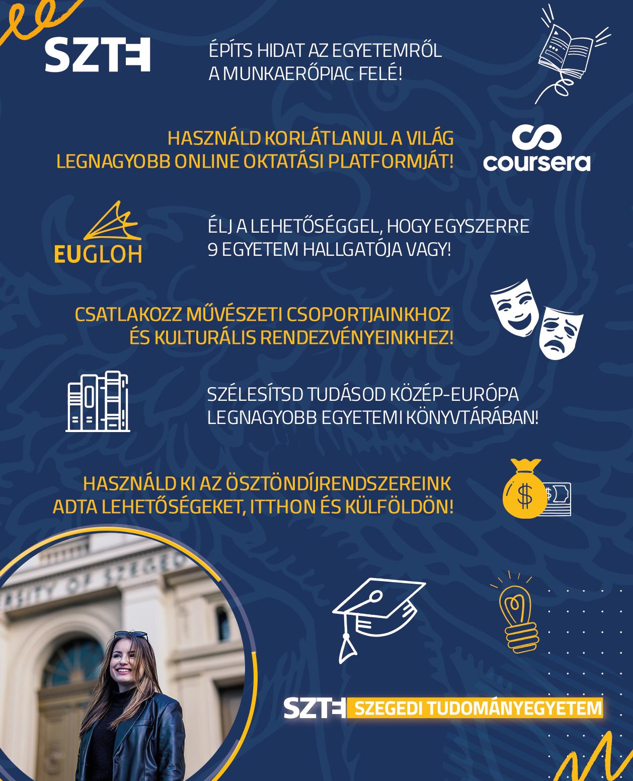 kat beszámíthatják az egyetemi tanulmányaikba, és remek lehetőséget jelentenek a nyelvi készségek, különösen a szakmai nyelvtudás fejlesztésében. A középiskolások pedig a Coursera for SZTE programon keresztül készülhetnek szegedi egyetemi tanulmányaikra.