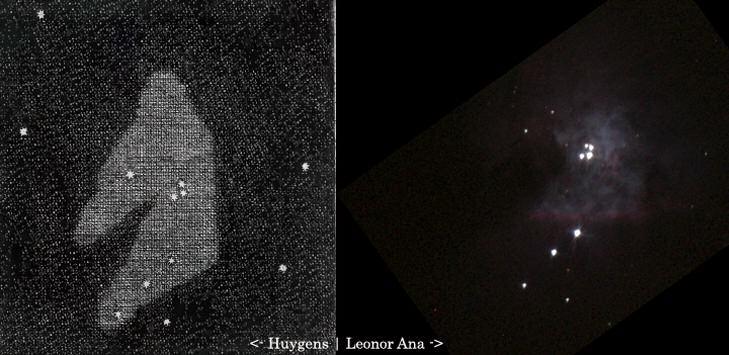 Este pasaje del libro nos invita a escuchar la voz de Christiaan Huygens en boca de Holden: ...Huygens dice que, al examinar las estrellas de la espada de Orión en 1656 con un telescopio, percibió, en lugar de las tres estrellas conocidas, doce en total, de las cuales tres estaban muy juntas y otras cuatro que brillaban como a través de una nube, de modo que el espacio a su alrededor parecía mucho más brillante que el resto del cielo, que era sereno y bastante negro, de modo que la sensación que producía era como mirar a través de una abertura Y 28 años después, seguramente tras las mejoras en los telescopios y oculares, algo cambió El 8 de enero de 1684, percibió por primera vez que el grupo de estrellas en la nebulosa de Orión en el que, hasta la fecha, solo había podido distinguir tres estrellas con dificultad, estaba compuesto por cuatro Junto a esta nota, encontramos en el diario de Huygen otra observación. Esta es la última nota astronómica hecha por él.