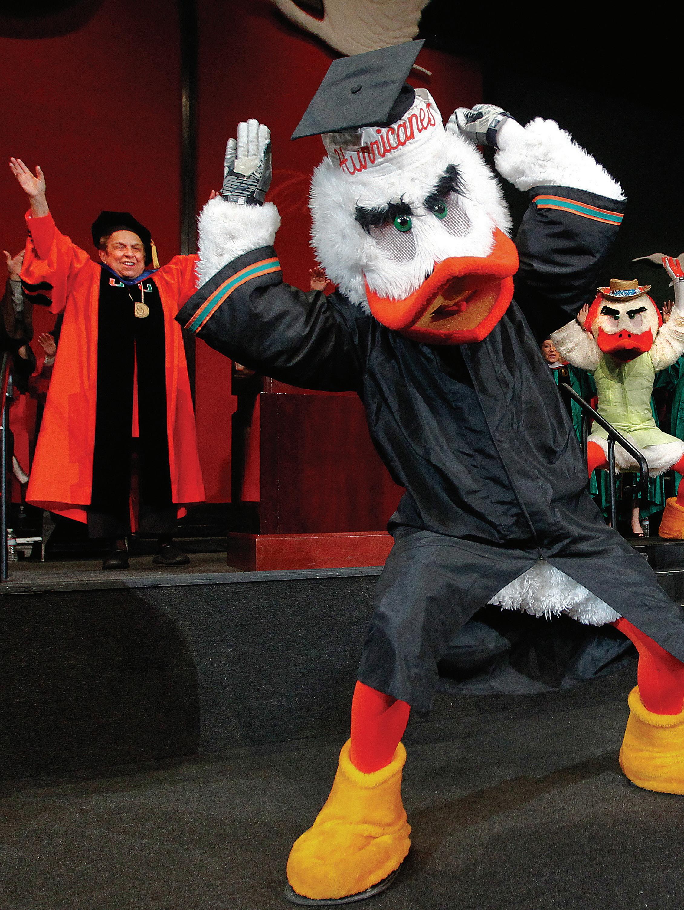 UM President Donna E. Shalala and her buddy, Sebastian the Ibis, lead thousands of Spring 2013 graduates in a rousing ’Canes spell-out cheer.