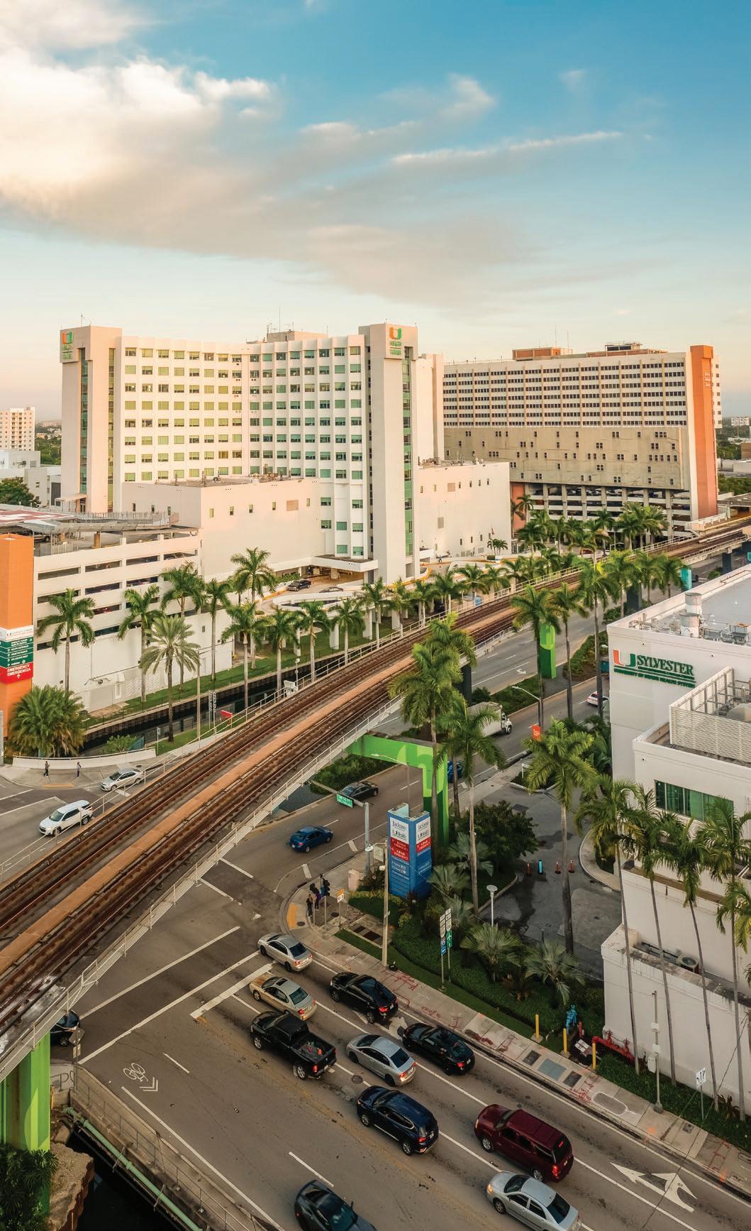Medical Campus: The Medical Campus includes the Leonard M. Miller School of Medicine and consists of 70 acres within the University of Miami/Jackson Memorial Medical Center complex. The Medical Campus includes the University of Miami Health System (UHealth), which comprises nationally ranked* institutions including Bascom Palmer Eye Institute (No. 1), neurology/neurosurgery (No. 25), and UHealth Tower (No. 3 hospital in South Florida and No. 9 in Florida). It is also home to the only NCI-designated cancer center in South Florida, Sylvester Comprehensive Cancer Center. Affiliated hospitals include Jackson Memorial Hospital and the Miami Veterans Affairs Medical Center, among others. More than three dozen UHealth outpatient clinics are located in Miami-Dade, Broward, Palm Beach, and Collier counties, The Lennar Foundation Medical Center is a 206,000-square-foot multispecialty ambulatory care facility located on the Coral Gables Campus, and UHealth Doral Medical Center is a six-story multispecialty facility in Downtown Doral. UHealth SoLé Mia, an expansive 7-story, 370,000-squarefoot-facility, will be the system’s largest multispecialty ambulatory care clinic, slated to open in 2025. The Miller School faculty