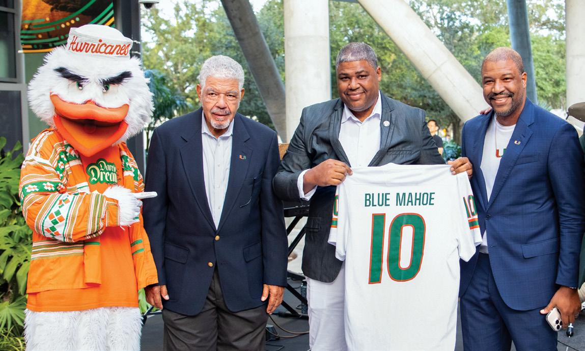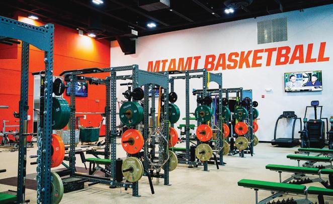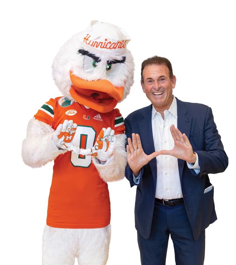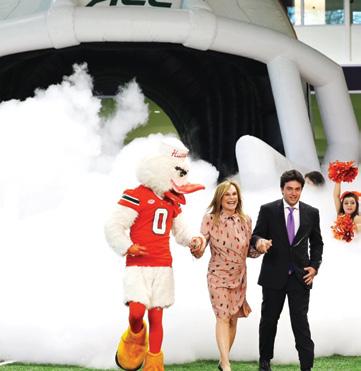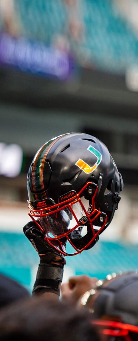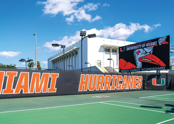 Baseball scored some big home runs when longtime Canes supporters Jimmy and Kim Klotz made the lead gift towards the new 6,800-square-foot baseball practice facility—named in their honor. It features batting cages, three pitchers’ mounds, and a multi-purpose area, along with state-of-the-art technology. This gift from the Klotz family was one of several during Ever Brighter, which also included support for football. Miami baseball alumnus Tommy Adams and his wife, Mayumi, provided a generous gift to enhance Mark Light Field, resulting in the renaming of the home plate entrance to Alex Rodriguez Park in his honor. Mayra Ruiz and family made a gift to enhance the weight room at the stadium while the DiMare family, longtime University of Miami supporters, funded the new stateof-the-art DiMare Family Scoreboard.